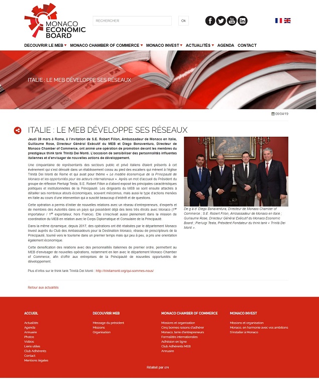 - Monaco Economic Board: “Italie: le MEB développe ses réseaux” (articolo sul sito del Think Tank) – 05/04/2019