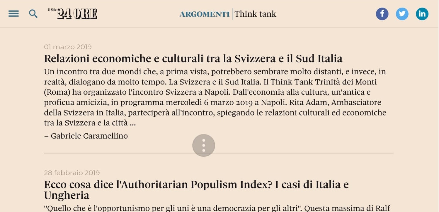 - Nòva – IlSole24Ore: “Relazioni economiche e culturali tra la Svizzera e il Sud Italia” (articolo sul sito del Think Tank) – 01/03/2019