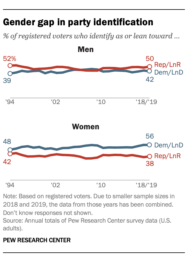 As shown in Figure 1, the gender gap in party identification has been widening since 1994 until today, with the Democratic Party currently having a wide advantage with women, 56% of whom identified as Democrats or leaned towards the Democratic Party in 2018/19 (Pew Research Center, 2020a).