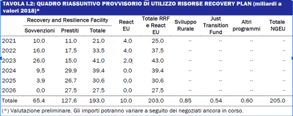 Oltre a predisporre le linee guida per la selezione dei progetti da finanziare, il governo ha definito il quadro dell’utilizzo delle risorse: le sovvenzioni saranno sfruttate interamente, mentre i prestiti saranno sottoscritti a seconda delle esigenze di bilancio. Il piano temporale prevede l’utilizzo nel prossimo triennio dell’80% delle sovvenzioni, ma di solo il 35% dei prestiti. Lo squilibrio temporale nell’utilizzo delle sovvenzioni permette invece di riassorbire eventuali ritardi nella realizzazione dei progetti, che determinerebbero altrimenti la perdita dei finanziamenti.