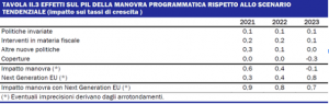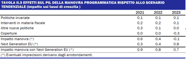 Gli interventi nella prossima Legge di Bilancio e l’utilizzo dei fondi europei risulteranno in una crescita più sostenuta del PIL dei prossimi anni. L’aumento per il 2021 sarà del 6%, nel 2022 si attesterà al 3,8% per poi discendere al 2,5% del 2023. Questo slancio permetterà un ritorno del PIL a livello pre-crisi già nel terzo trimestre del 2022, anticipato di oltre un anno rispetto alla fine del 2023 prevista nel quadro tendenziale. Se nel 2021 e 2022 la politica fiscale sarà espansiva, nel 2023 si prevede un rientro con l’aumento delle coperture, i cui effetti restrittivi saranno però compensati dell’utilizzo dei fondi europei.