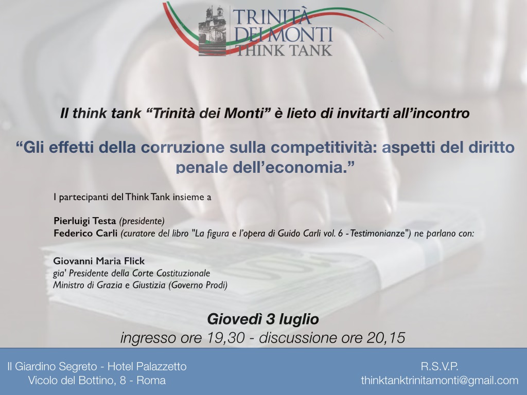 Giovedì 3 luglio 2014 alle ore 19:30, all’Hotel Il Palazzetto in Roma, si è svolto l’incontro dal titolo “Gli effetti della corruzione sulla competitività: aspetti del diritto penale dell’economia“. Special guest Giovanni Maria Flick, Presidente Emerito della Corte Costituzionale.