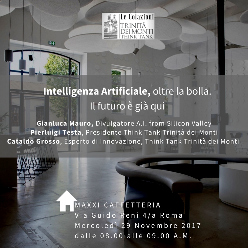 Mercoledì 29 novembre 2017, presso la Caffetteria del MAXXI – Museo nazionale delle arti del XXI secolo, si è svolto l’incontro “Intelligenza Artificiale, oltre la bolla. Il futuro è già qui”. Ospite della prima colazione organizzata dal Think Tank Trinità dei Monti, Gianluca Mauro, divulgatore di tematiche inerenti l’Intelligenza Artificiale