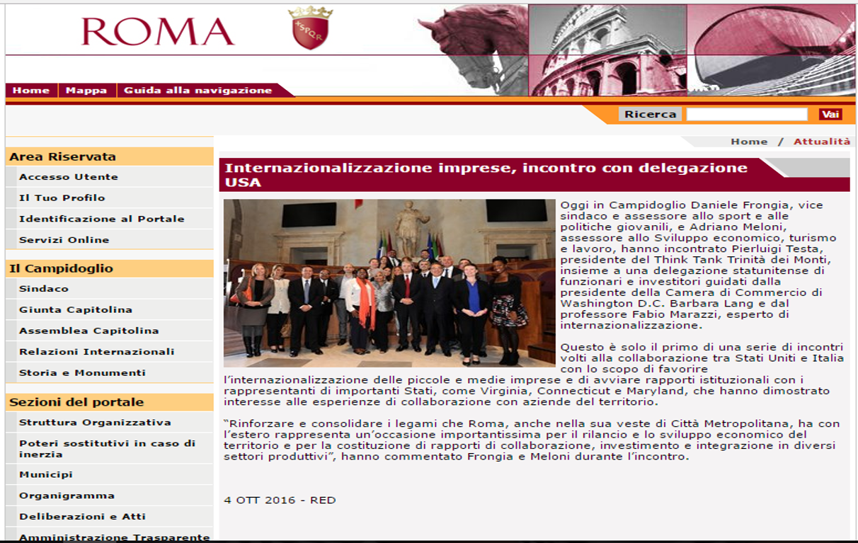 Il 4 Ottobre, in Campidoglio, Pierluigi Testa, presidente del Think Tank Trinità dei Monti, insieme a una delegazione statunitense di funzionari e investitori guidati dalla presidente della Camera di Commercio di Washington D.C. Barbara Lang e dal professore Fabio Marazzi, esperto di internazionalizzazione, hanno incontrato Daniele Frongia, vice sindaco e assessore allo sport e alle politiche giovanili, e Adriano Meloni, assessore allo Sviluppo economico, turismo e lavoro. Il primo di una serie di incontri volti alla collaborazione tra Stati Uniti e Italia con lo scopo di favorire l’internazionalizzazione delle piccole e medie imprese e di avviare rapporti istituzionali con i rappresentanti di importanti Stati, come Virginia, Connecticut e Maryland.