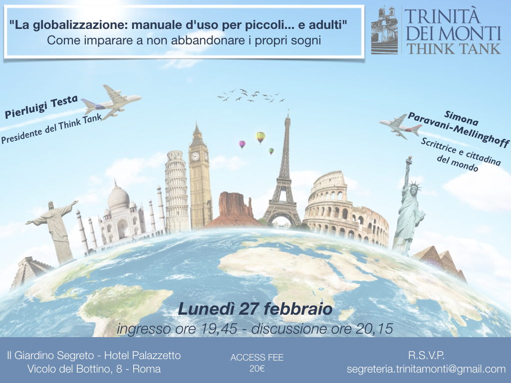 Lunedì 27 febbraio 2017 alle ore 19:30, si è svolto presso l’Hotel Il Palazzetto in Roma, l’incontro dal titolo “La Globalizzazione: manuale d’uso per piccoli… e adulti – Come imparare a non abbandonare i propri sogni” . Special guest di serata la dr.ssa Simona Paravani-Mellinghoff, esperta internazionale di finanza, scrittrice, cittadina del mondo.