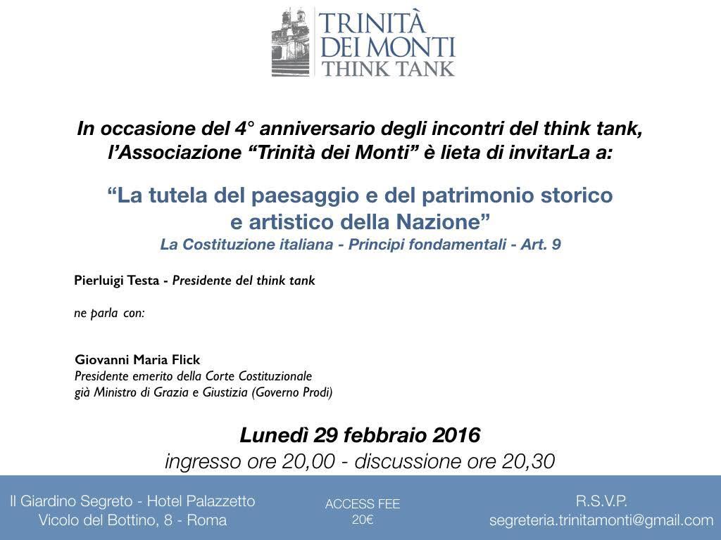 Lunedì 29 febbraio 2016 – in occasione del IV Anniversario del Think Tank Trinità dei Monti – all’Hotel Il Palazzetto in Roma si è svolto l’incontro dal titolo “La tutela del paesaggio e del patrimonio artistico della Nazione“. Special guest Giovanni Maria Flick, Presidente Emerito della Corte Costituzionale.